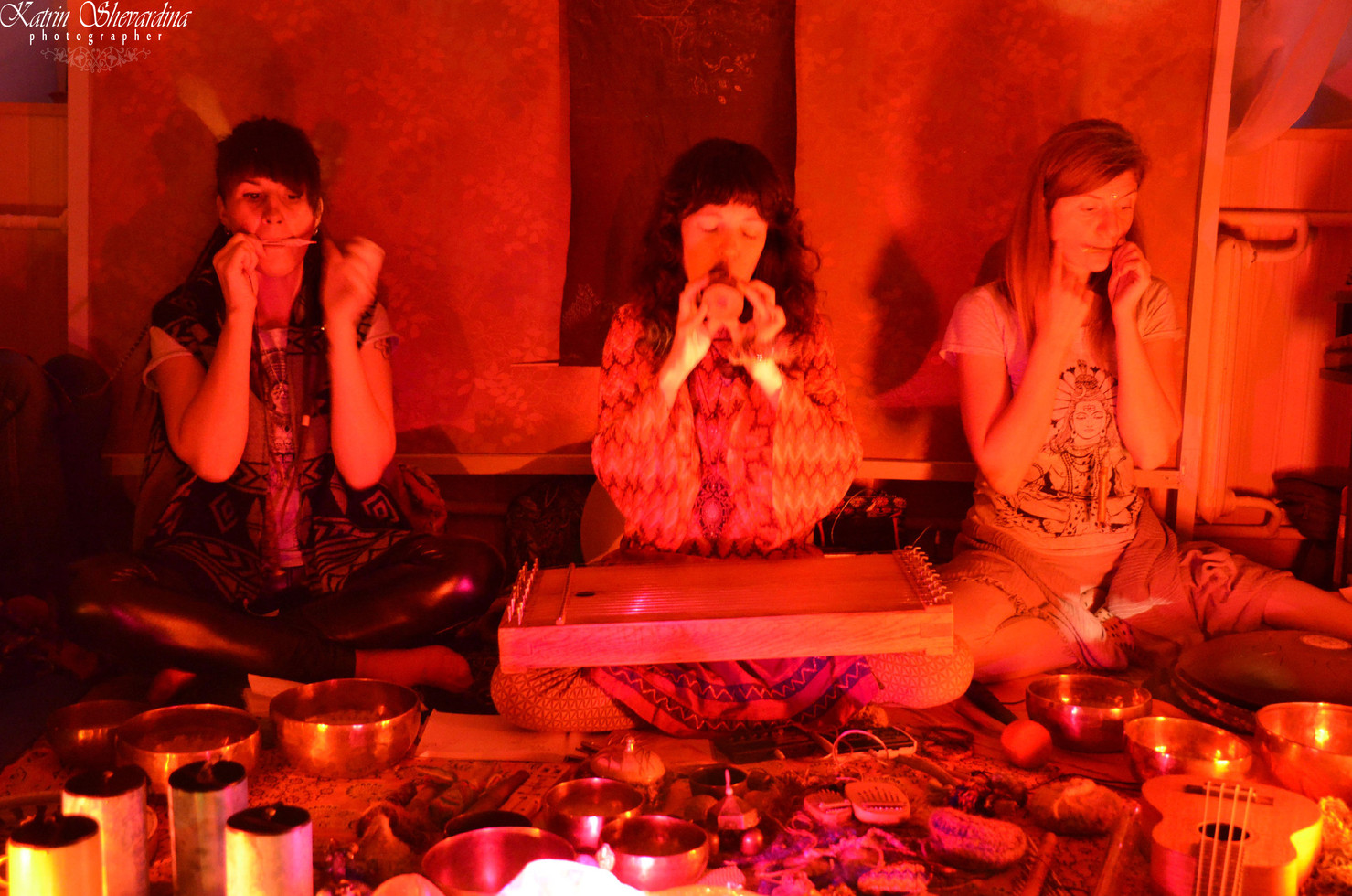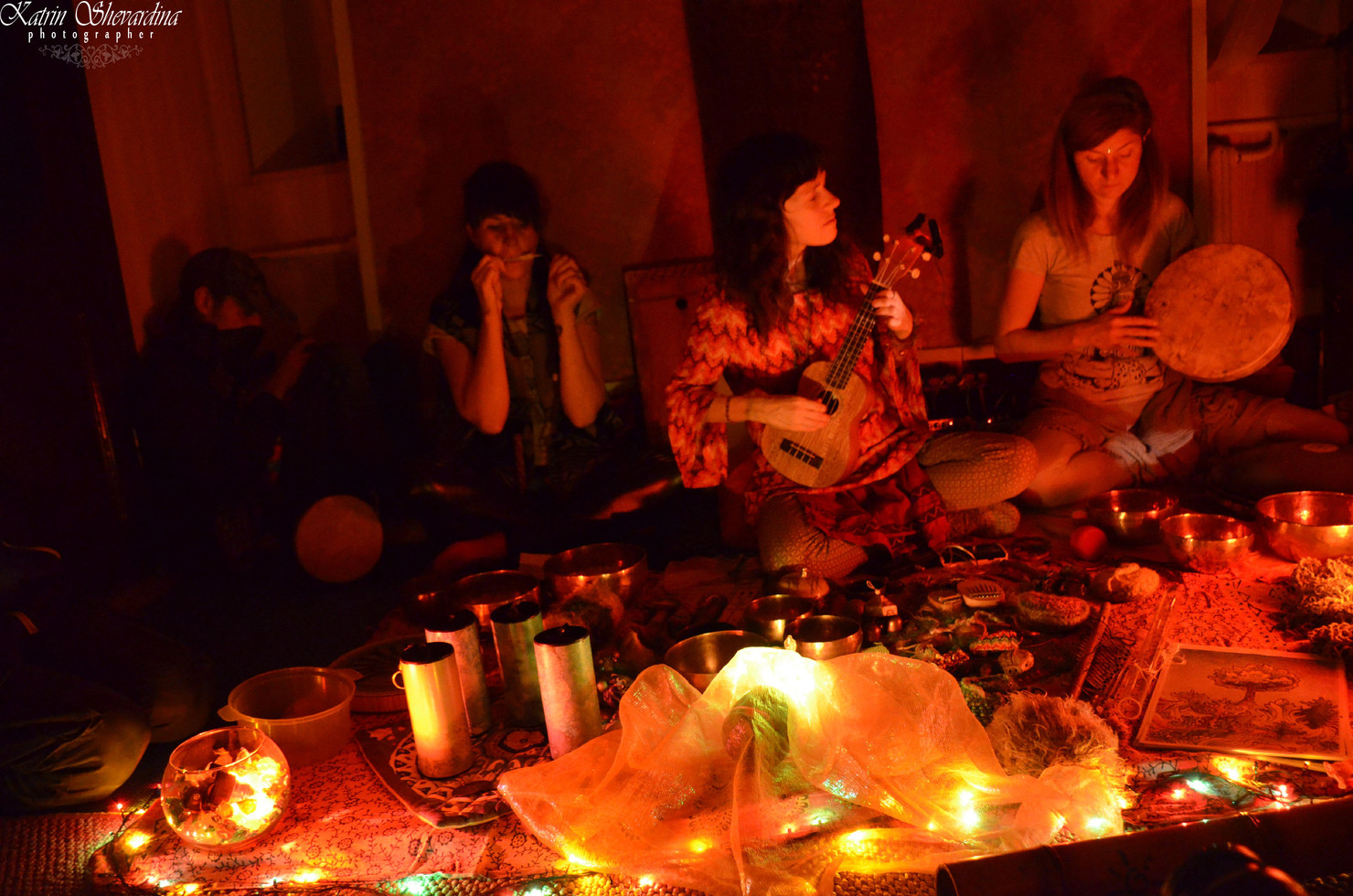 Благодаря таланту музыкантов создавались потрясающие звуковые сочетания, переносящие слушателей в яркие параллельные миры. Набор концертных инструментов заслуживает особого внимания, поскольку довольно необычен и прекрасен. Во время перфоманса можно было насладиться звучанием калимбы, монохорда, бубнов, барабана, поющих чаш, шума ручья, посоха дождя, варганов, ну и конечно все случилось не без помощи волшебства)